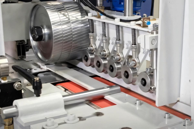 Подача ламелей с предварительным наживлением на минишип в пресс сращивания осуществляется с помощью приводных рифленых вальцов с пневматическим прижимом верхних вальцов. Обеспечивается беспрерывная подача и надежное формирование плети из ламелей с предварительным натягом, что гарантирует точную отрезку плети на заданный размер.