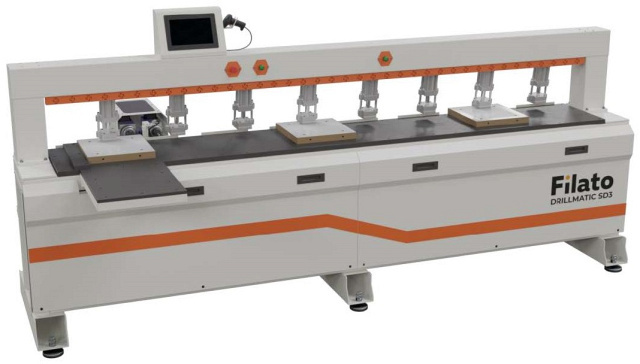 Filato Drillmatic SD3 — предназначен для присадки отверстий и выборки паза в торце заготовки. В памяти создается библиотека различных карт присадок, и станок может работать в поточном режиме без перенастроек. Он прост в эксплуатации и обладает более высокой точностью обработки, чем полуавтоматическое оборудование. Можно управлять и обрабатывать по зонам, что экономично и эффективно.