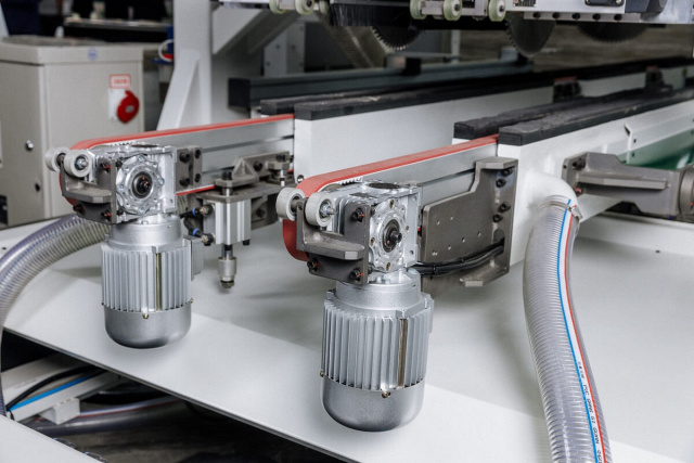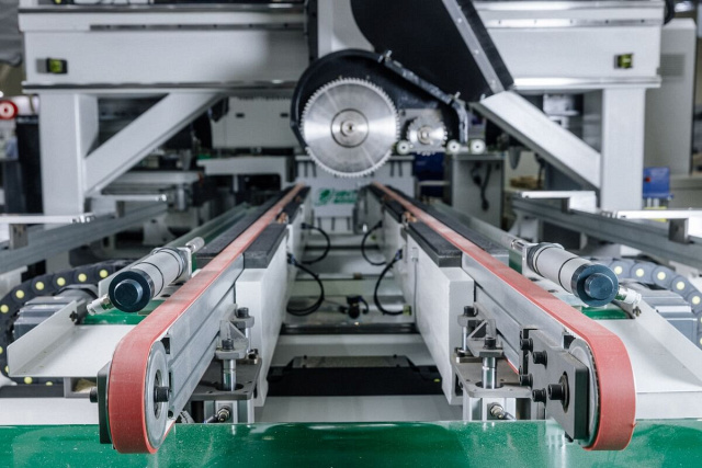 Позволяет значительно сократить время на загрузку и базировку тяжёлых дверных полотен, что определенно облегчит труд операторов и повысит производительность. Дверное полотно движется по двум ременным конвейерным лентам и по достижению концевого выключателя происходит срабатывание базирующих упоров, которые чётко позиционируют полотно с трёх сторон.