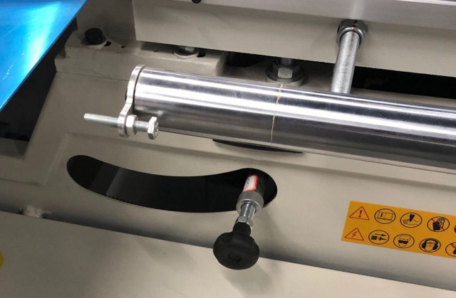 Управление продольным упором осуществляется через ЧПУ контролер. Перемещения упора осуществляется при помощи сервомотора и высокоточной шариковинтовой пары. Это обеспечивает плавность хода и точность выставления размера в 0,1 мм. Скорость перемещения достигает до 15 м/мин.
