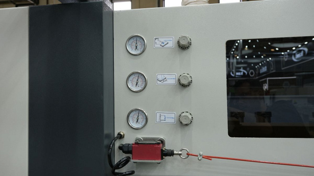 В станке предусмотрена ручная регулировка усилий прижатий при помощи пневматики, а именно прижимной балки, захватов и выравнивателя. Что имеет возможность работать с очень деликатными материалами не повреждая их во время работы.