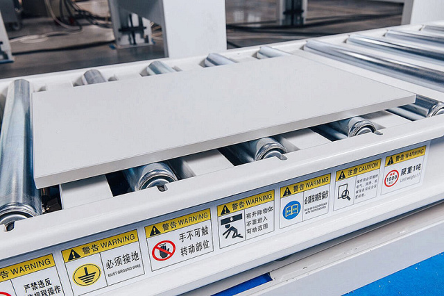 В нижнем положении стола (300 мм.) неприводные ролики находятся в верхнем положении, что позволяет осуществлять легкое перемещение пачки заготовок с рольгангов линии. При подъеме стола рама платформы поднимается выше роликов и пачка материала фиксируется на прямоугольных профилях, что препятствует случайному перемещению.