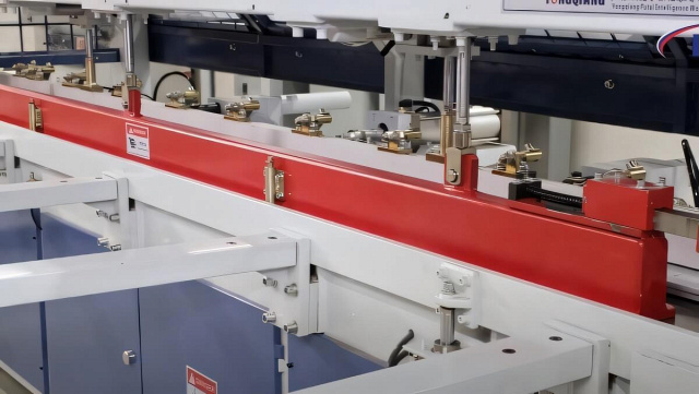 Зона набора плети ограничивается боковой базовой линейкой и ограничительной балкой, настраиваемой, в зависимости от ширины заготовок, с помощью маховика и реечной передачи. Подъем и опускание балки осуществляется пневмоцилиндрами. На ограничительной балке имеются верхние прижимные плоские пружины. Обеспечивается более точное формирование плети по ширине и снижение припуска на дальнейшую обработку.