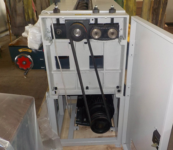 ![]() | Привод ножевого вала Надежный привод ножевого вала от главного электрического двигателя мощностью 15 кВт через 3 клиновых ремня. |