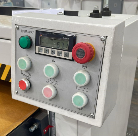 ![]() | Пульт управления На пульте расположен дисплей с электронной индикацией положения стола, а также кнопки включения/выключения ножевого вала и подающих вальцов, подъема/опускания стола и кнопка аварийной остановки. Электронная индикация положения стола позволяет устанавливать толщину обработки с точностью до 0,1мм. |